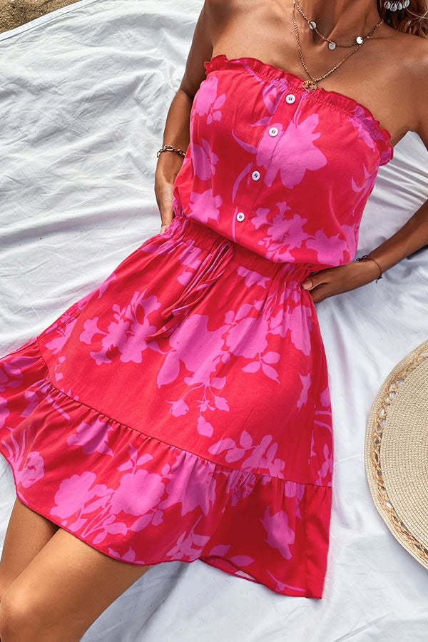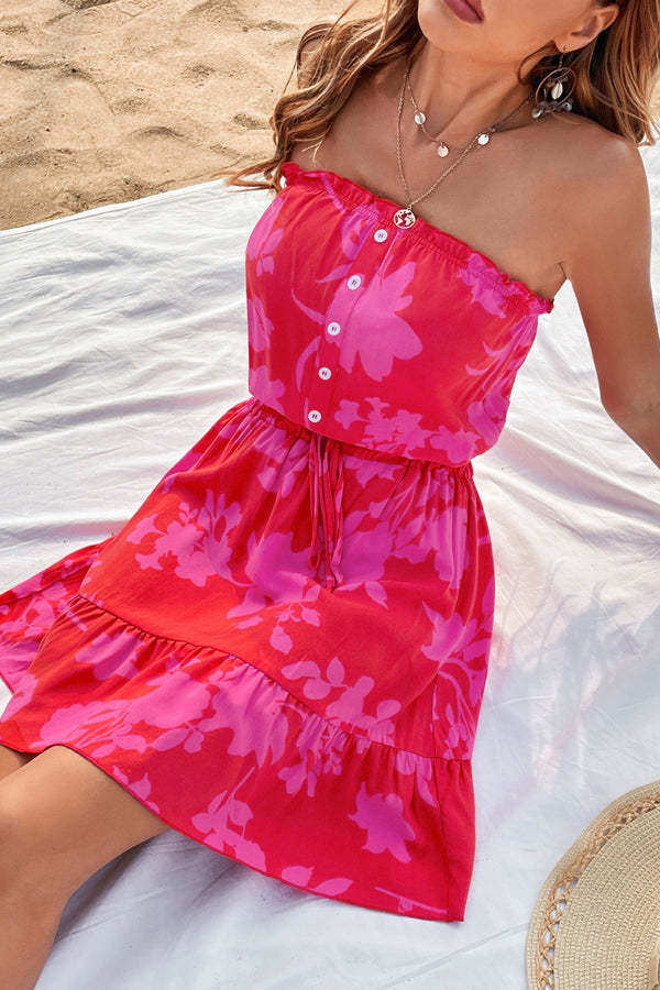 • Fashion Floral Print Strapless Tie Waist Casual Dress