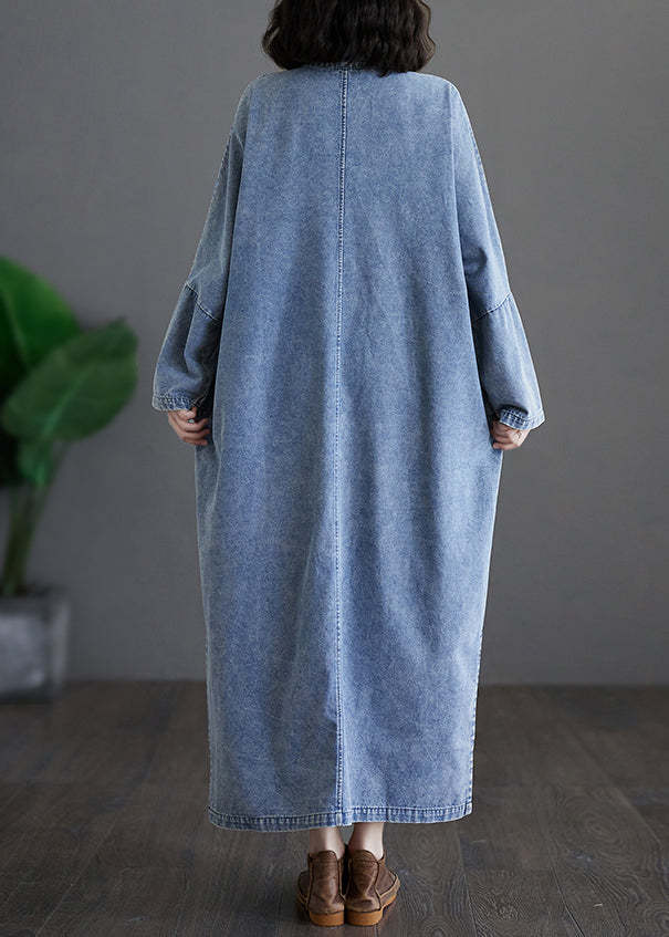 Plus Size Denim Blue Stand Collar Patchwork Button Side Open Maxi Dresses Spring