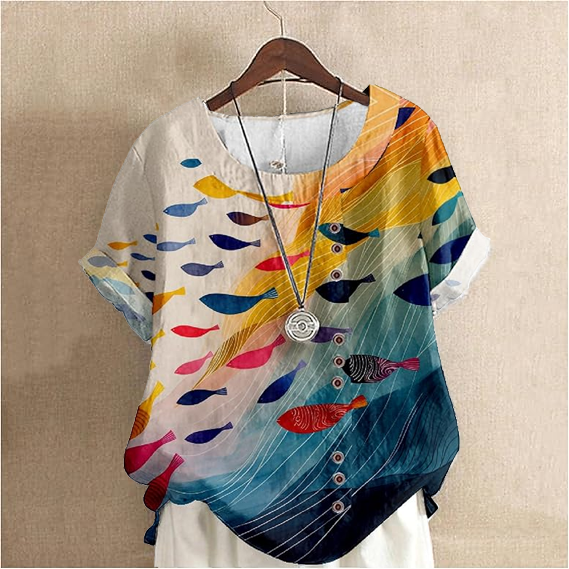 Women's Art Fish Pattern Cotton And Linen Short Sleeve Top