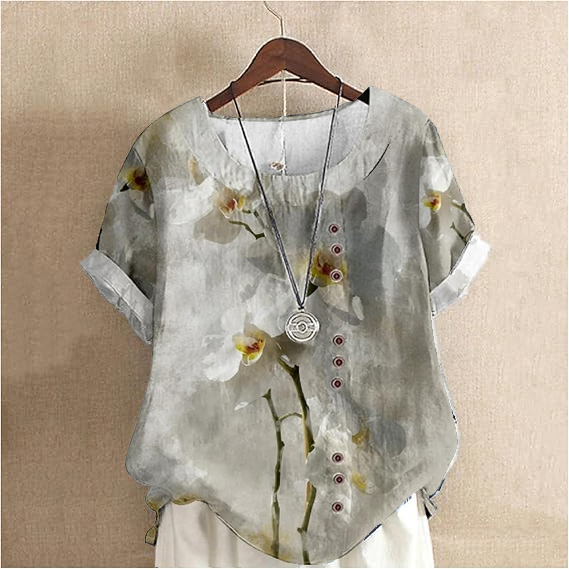 Women's Elegant Watercolor Art Simple Flowers Cotton And Linen Short Sleeve Top