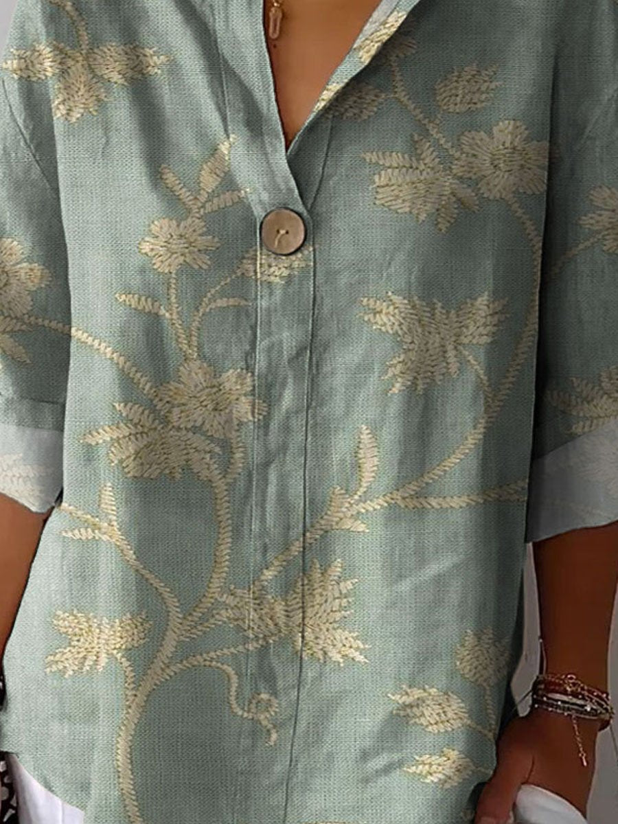 Women's Vintage Floral Art Print Casual Cotton Linen Shirt