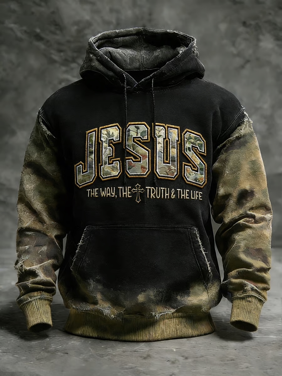 Men's Faith Embroidered Hooded Top, Vintage Distressed Camo Panel Jesus Christian Slogan "The Way, The Truth & The Life" Pullover Hoodie