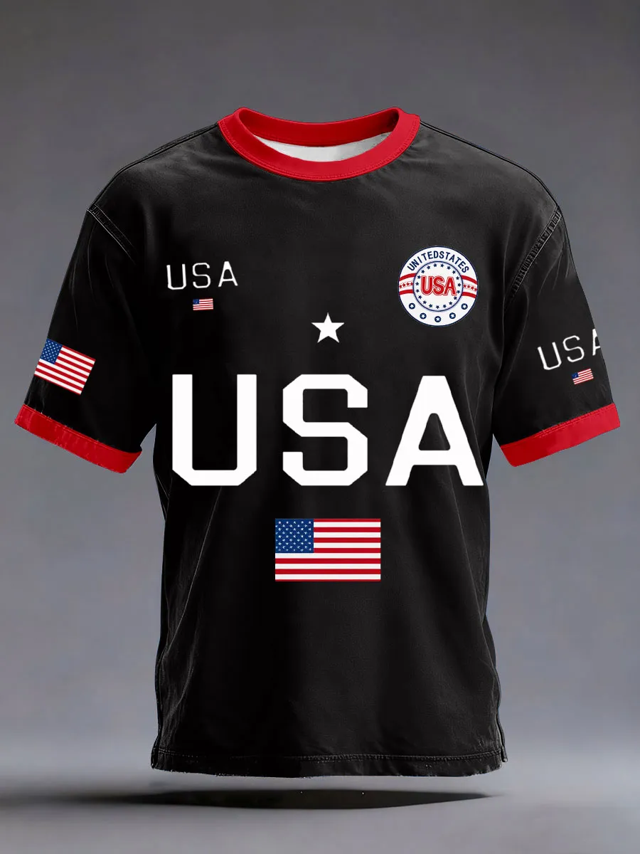 Men's USA Flag Print T-Shirts - Red Contrast Neck & Cuff Crew Neck Casual Patriotic Graphic Tees (Black & White Options)