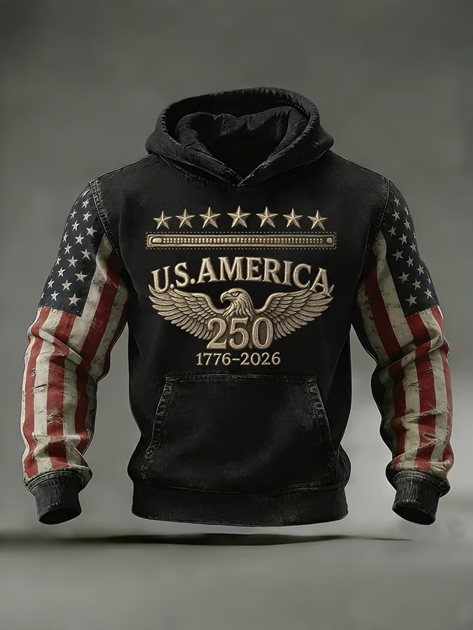 Men's Retro American 250th Anniversary (1776-2026) Print Hooded Sweatshirt - Distressed USA Flag Sleeve Eagle Wing Embroidery Patriotic Black Waffle Knit Pullover