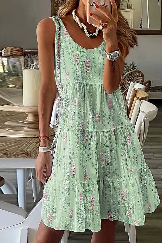 Embrace fashion-forward elegance with Floral Pleated A-Line Mini Dress. This chic ensemble features a U-neckline and sleeveless design, exuding boho charm. The floral print and pleated details add a touch of sophistication to its loose silhouette.