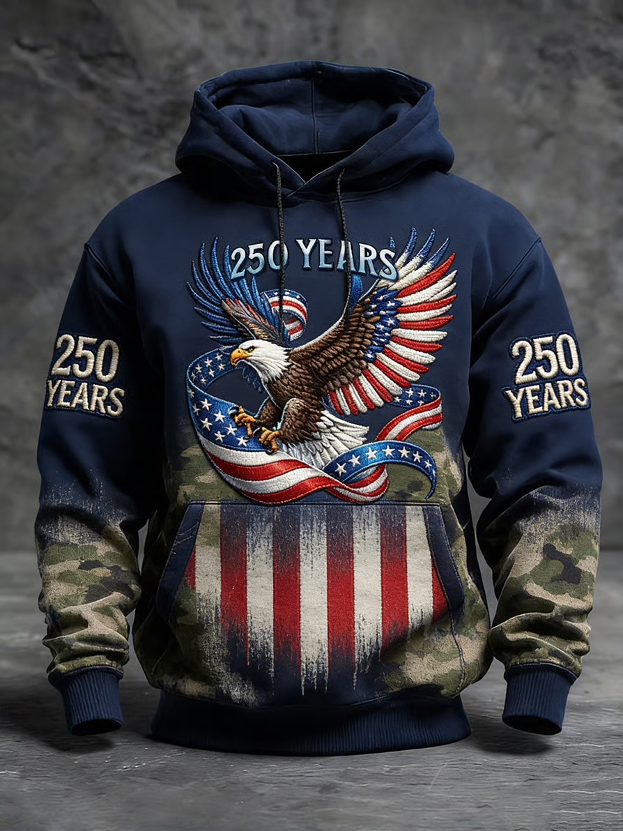 Men's 250th Anniversary of the Founding of the United States (1776-2026) Hoodie, Navy Blue Embroidered Eagle & American Flag Patriotic Pullover Hooded Sweatshirt with Camo Panel and Distressed Striped Pocket