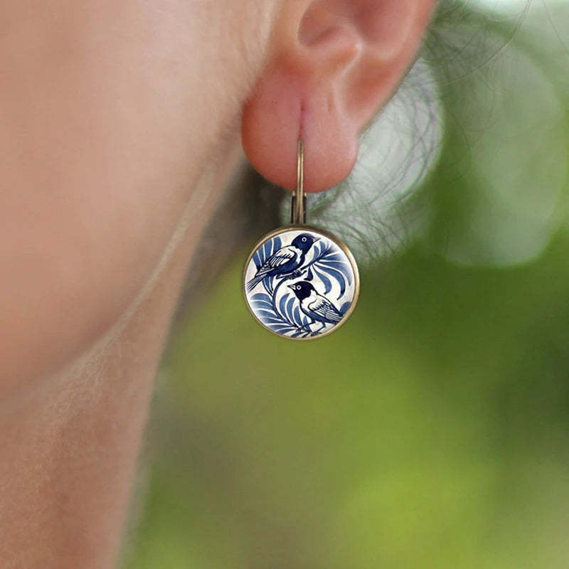 Each earring tells a story of freedom and grace, featuring the elegant silhouette of a blue magpie—a bird long celebrated as a symbol of joy, good fortune, and the arrival of welcomed guests. The antique bronze setting cradles these miniature works of art like treasured heirlooms passed down through generations.