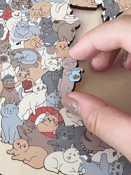 Each puzzle piece is meticulously designed, each with its own unique shape. Some resemble cat paws, while others depict cats in various poses. The finely cut edges ensure a seamless fit when pieced together. The picture is filled with cats in various poses and expressions, some lazily reclining, others playfully gazing out. The intricate details allow you to glimpse into the cats' "little world," creating a joyful exploration as you complete the puzzle.